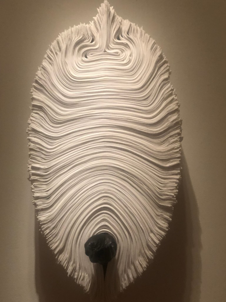 The tour was led by one of the museum curators who walked the tour group of about 20 through each of the pieces, shedding a little background and inspiration about the work and the story of its existence. One of my favorites was an Untitled, 2014 mixed media piece of cast bronze and cloth hand towels. The plate card read, “Casting his own arm in bronze, Cave assembles an object that speaks to the position of servitude that many African Americans have been forced to endure throughout history. The stack of neatly pressed white towels, similar to those found in a fancy restroom, forms a pattern that echoes the rings of a tree. The stack suggests the crushing number of years that black people, including the artist’s grandmother, have devoted to being in service to whites.” This piece was Courtesy of the artist and Jack Shainman Gallery, New York. Loved it.