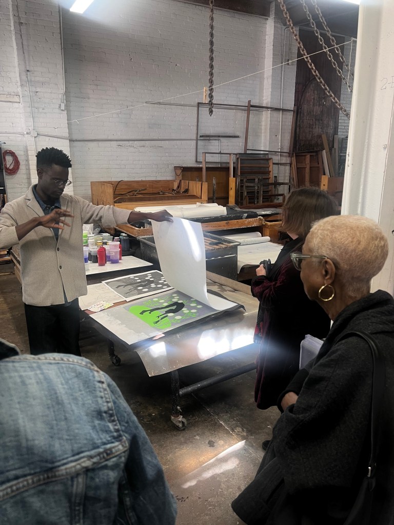 The new works in progress show a figure face-down, hands and feet pressed into the earth. It’s ambiguous: are they channeling something in, or drawing something out? Maybe both. Either way, it’s a landing. A grounding. A connection. In this medium, every color layer requires its own stencil, all created by hand, which, for Brackens, is essential. Working “in the wet,” as Brackens described it, adds another dimension of chance, mess, and materiality. We were able to see the paper pulp and two in-progress pieces during the visit. Watching them take shape was kind of mesmerizing… the care in placement… the patience of the process. The work had weight. Not just in content, but in material presence. I wasn’t sure how his signature sense of movement would translate from fiber to paper — but it did. Brackens use of a vibrant green base helped retain that sense of energy and visual charge. And the repetition of the process, maybe like the repetition of weaving imprints something new onto the work. Onto you, too. Some artists create just to create. And that’s valid. But others create to connect. To shift something in the world, or at least the room. Brackens’ work does that. It carries memory. It marks time. And still, it finds space to breathe. It’s beautiful work, but more than that it’s thoughtful.