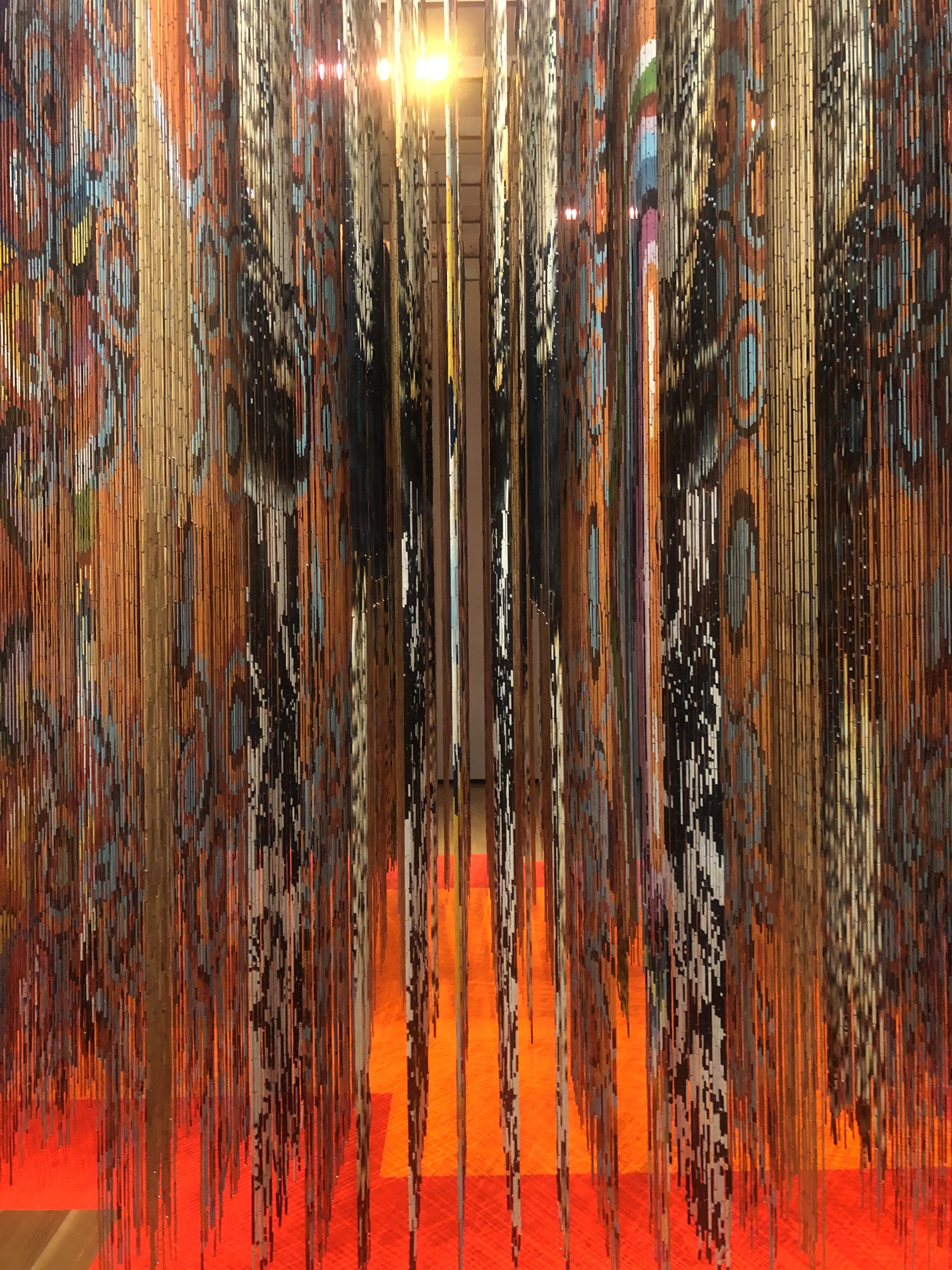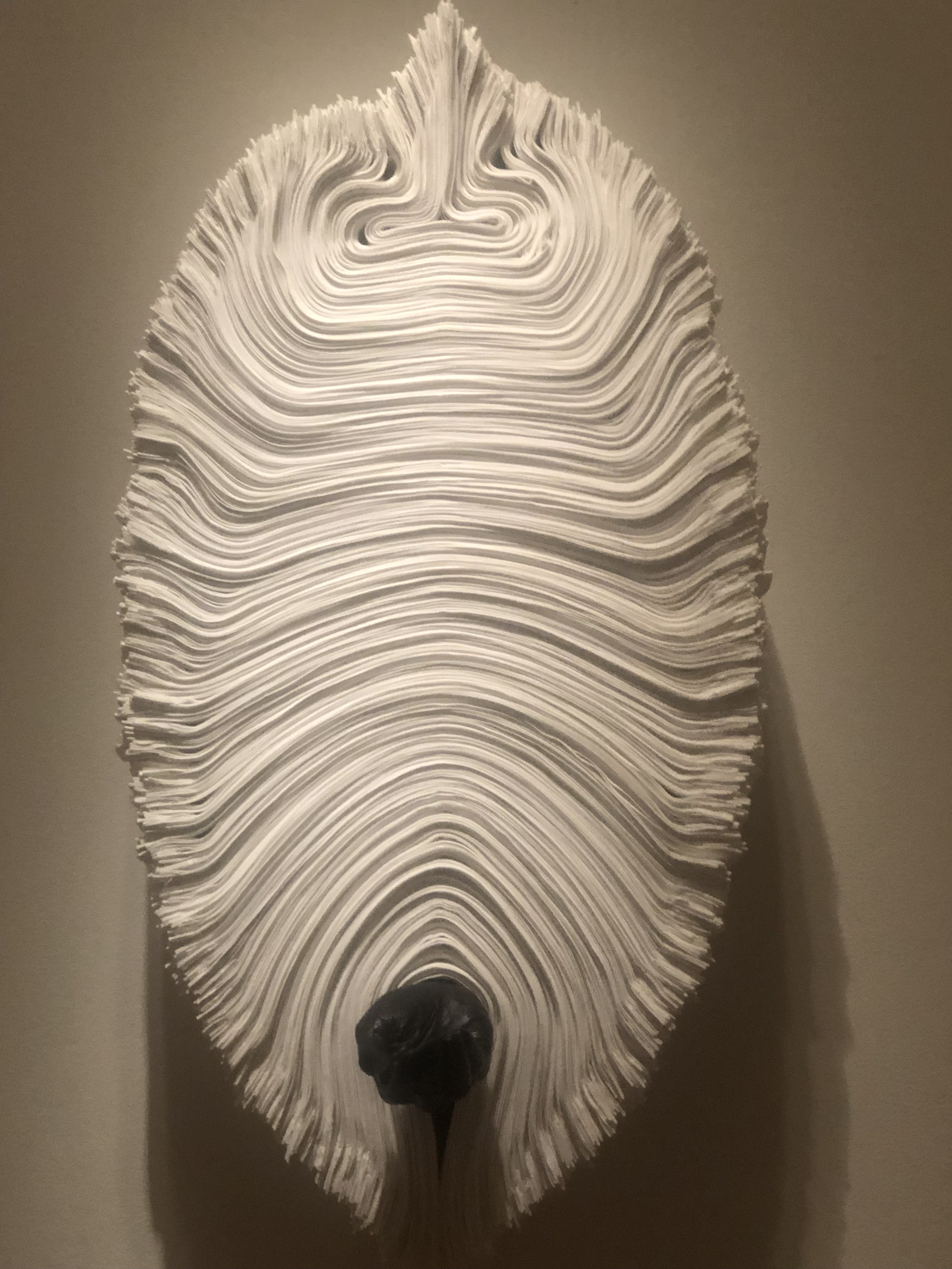 The tour was led by one of the museum curators who walked the tour group of about 20 through each of the pieces, shedding a little background and inspiration about the work and the story of its existence. One of my favorites was an Untitled, 2014 mixed media piece of cast bronze and cloth hand towels. The plate card read, “Casting his own arm in bronze, Cave assembles an object that speaks to the position of servitude that many African Americans have been forced to endure throughout history. The stack of neatly pressed white towels, similar to those found in a fancy restroom, forms a pattern that echoes the rings of a tree. The stack suggests the crushing number of years that black people, including the artist’s grandmother, have devoted to being in service to whites.” This piece was Courtesy of the artist and Jack Shainman Gallery, New York. Loved it.